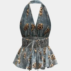 Retro Leopard Print Backless Tie-Up Ruched Drawstring Cami Top